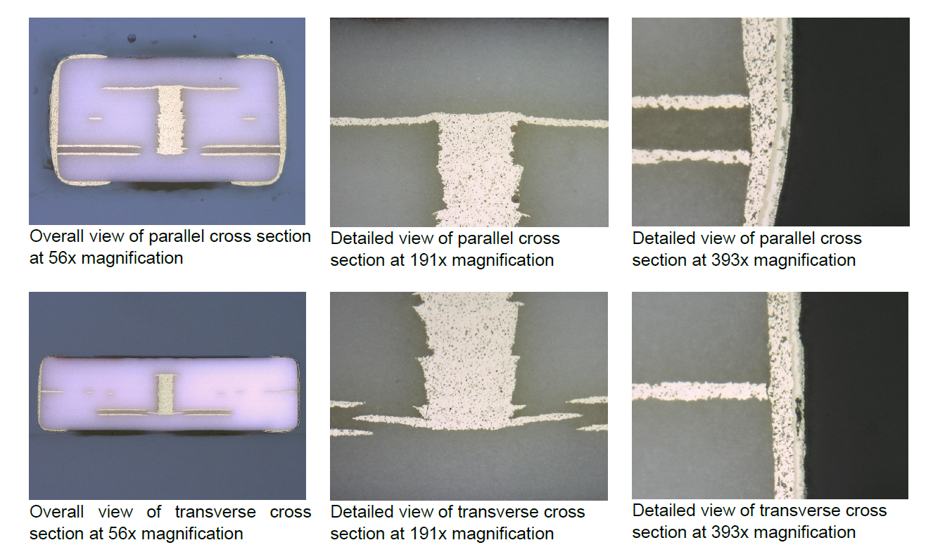 Prior to starting reliability testing, DPA is performed on 3 randomly selected sample units to verify the construction and termination composition on the lot to be used for production. MIL-STD-1580B is used to establish a general process for performing DPA on the units under test, but because pass/fail criteria for LTCC units are not defined by the standard, it is used as a guideline, and the units under test are compared to determine if there are any apparent anomalies. Photographs from external and internal examination of the sectioned devices are shown in Figure 1 and Figure 2. The DPA pass/fail criteria are summarized in Table 1.